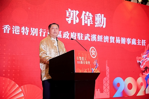 駐武漢辦主任郭偉勳在致辭時表示香港經濟已重回正軌,2023年經濟實現增長3.2%,市民收入有實質提升。農歷年期間,到訪香港的旅客數目已回復到2018年同期水平,內地入境旅行團數目及參與的總人次,更超過疫情前春節。